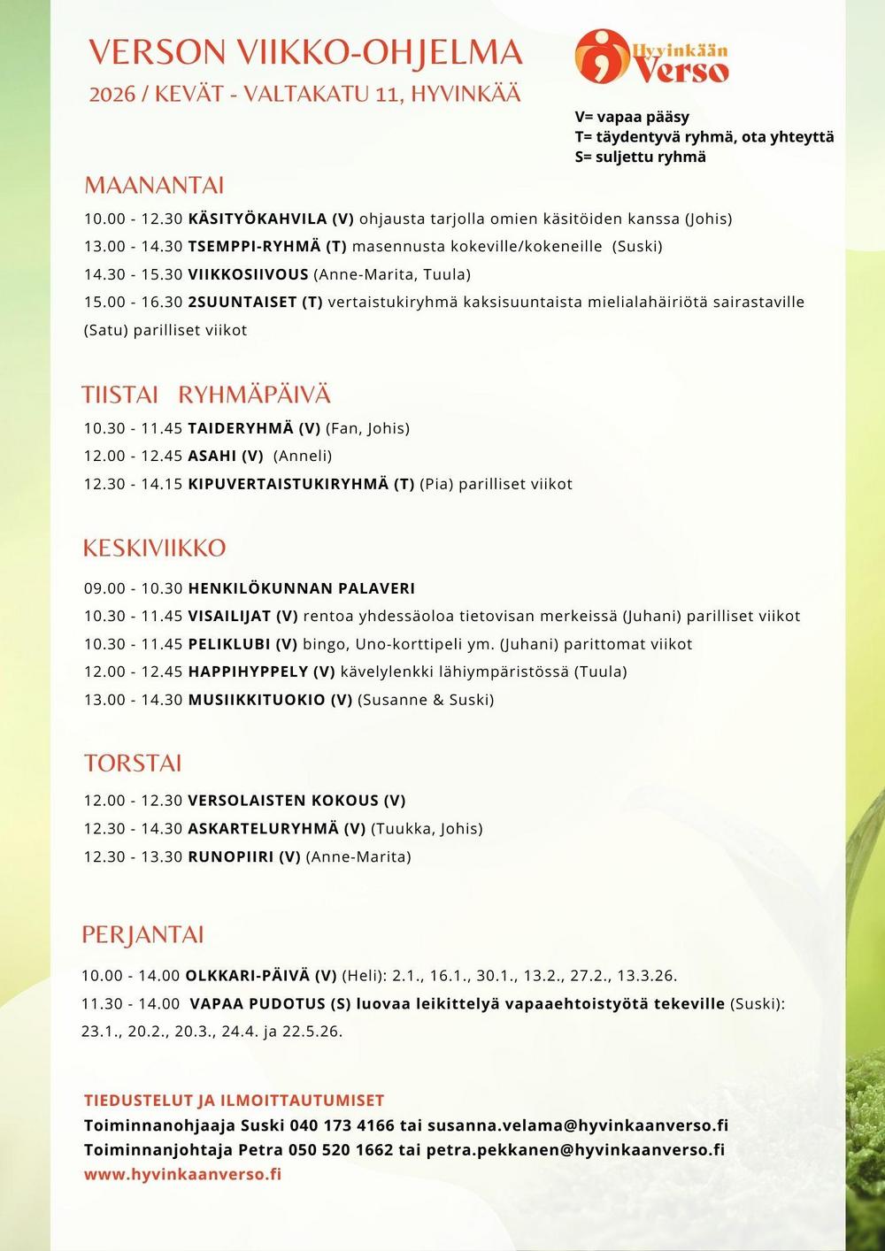 Tervetuloa tutustumaan Verson toimintaan ja mukaviin ihmisiin omia voimavarojasi kuunnellen, aidosti omana itsenäsi!