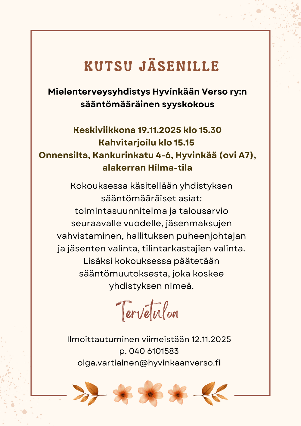 "Mielenterveysyhdistys Hyvinkään Verso ry kutsuu jäsenensä sääntömääräiseen syyskokoukseen keskiviikkona 19.11.2025 – tule mukaan vaikuttamaan ja kuulemaan yhdistyksen ajankohtaisista asioista!"