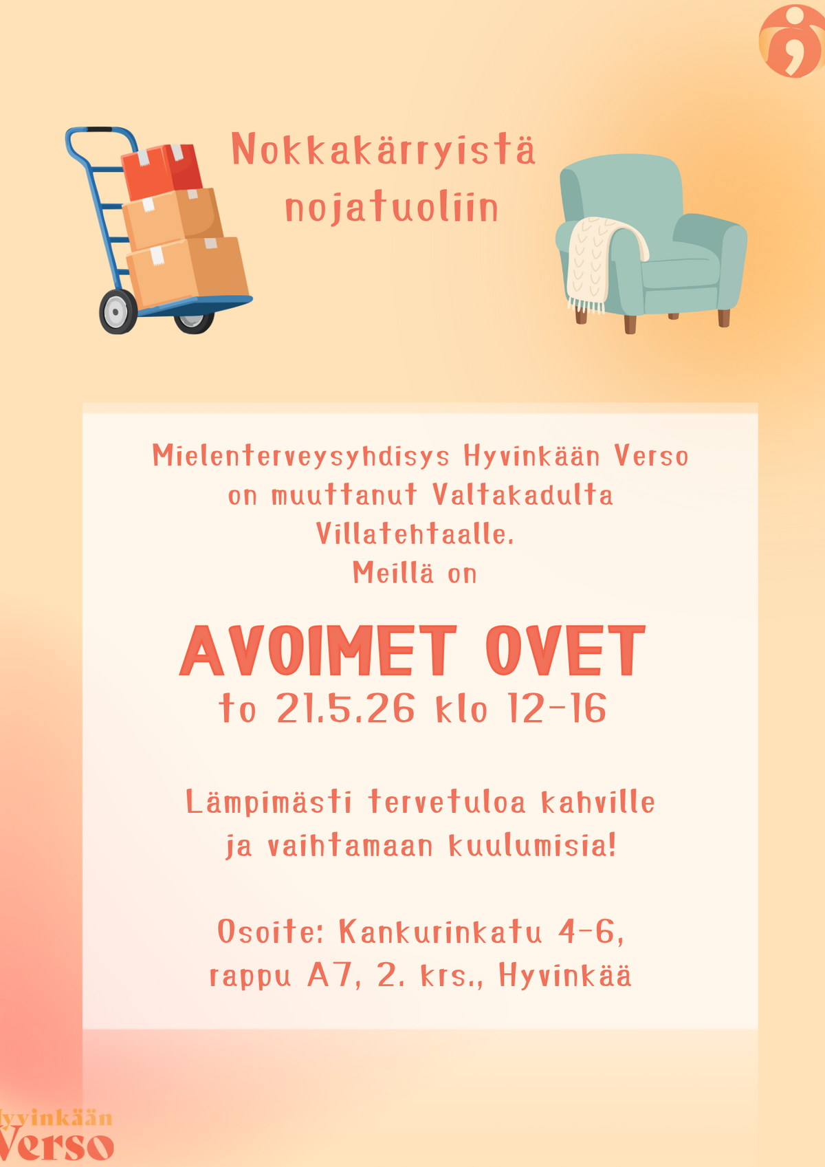 Verso kutsuu avoimiin oviin uusiin tiloihinsa. Yhdistys on muuttanut Villatehtaalle Onnensillan tiloihin. Avoimet ovet järjestetään torstaina 21.5.2026 klo 12–16. Tapahtumaan voi tulla liukuvasti itselle sopivaan aikaan. Tarjolla on kahvia ja mahdollisuus tutustua toimintaan. Samalla voi vaihtaa kuulumisia rennossa ilmapiirissä. Tilat sijaitsevat osoitteessa Kankurinkatu 4–6, rappu A7, 2. krs. Lämpimästi tervetuloa!