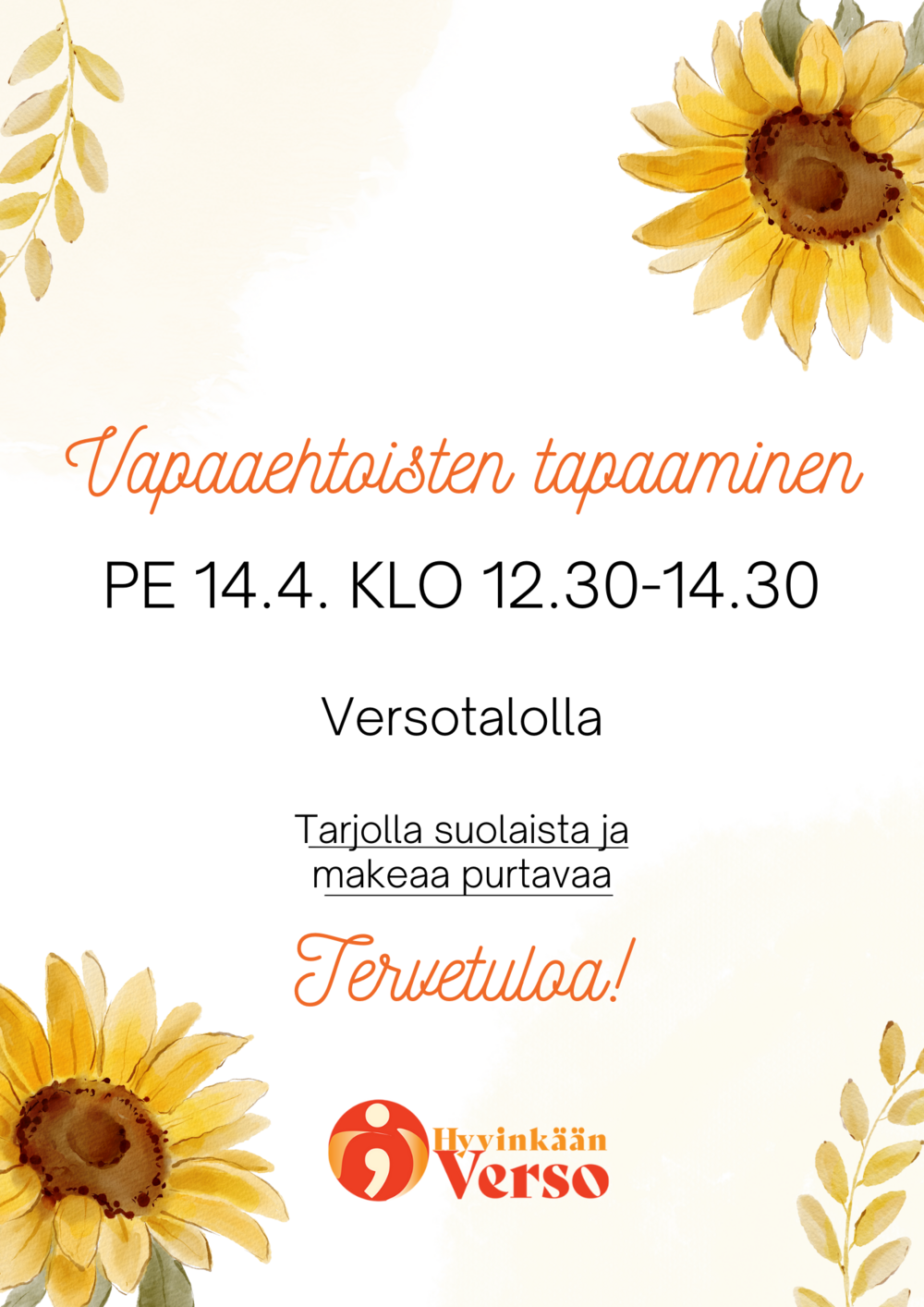 Tervetuloa vapaaehtoisten tapaamiseen Versotalolle pe 14.4.23 klo 12.30-14.30. Jaetaan kokemuksia, hyödynnetään vertaistukea, ideoidaan tulevaa ja kahvitellaan yhdessä.